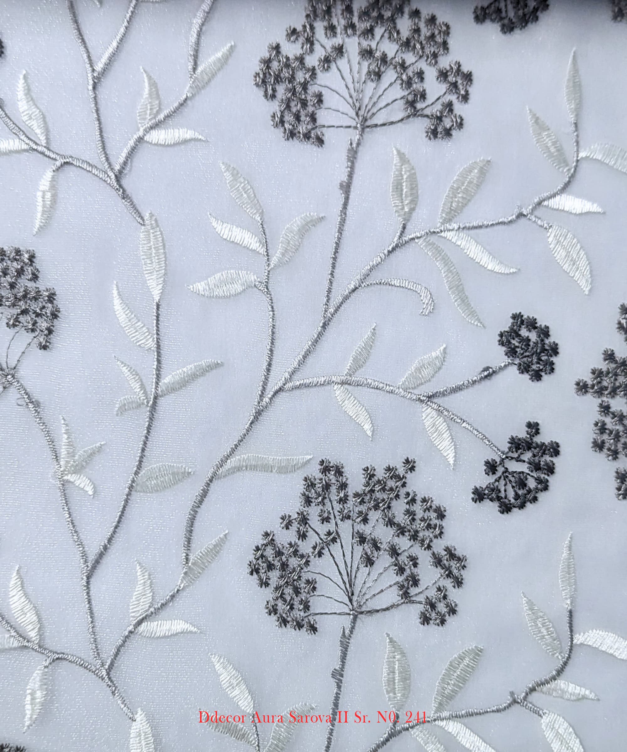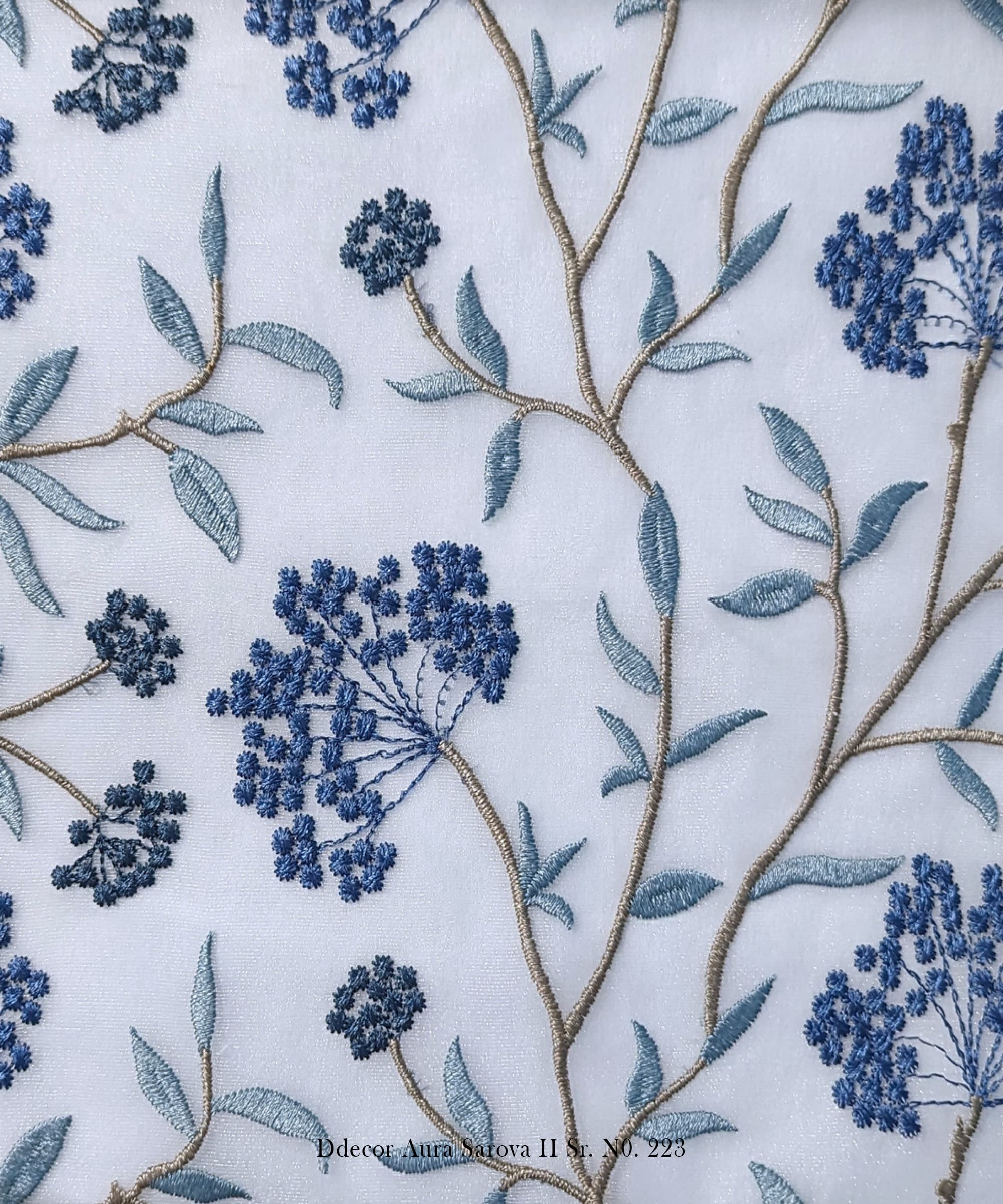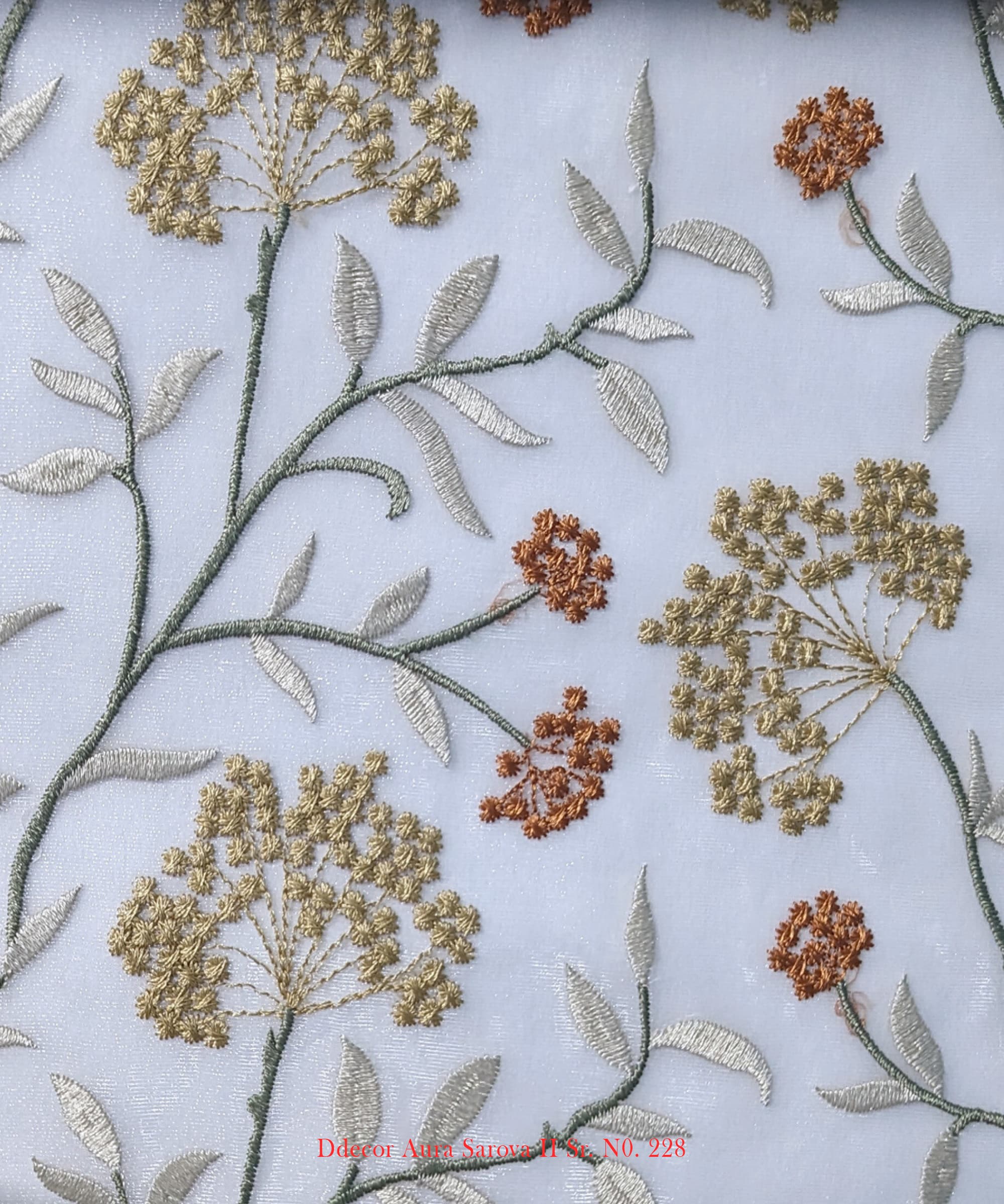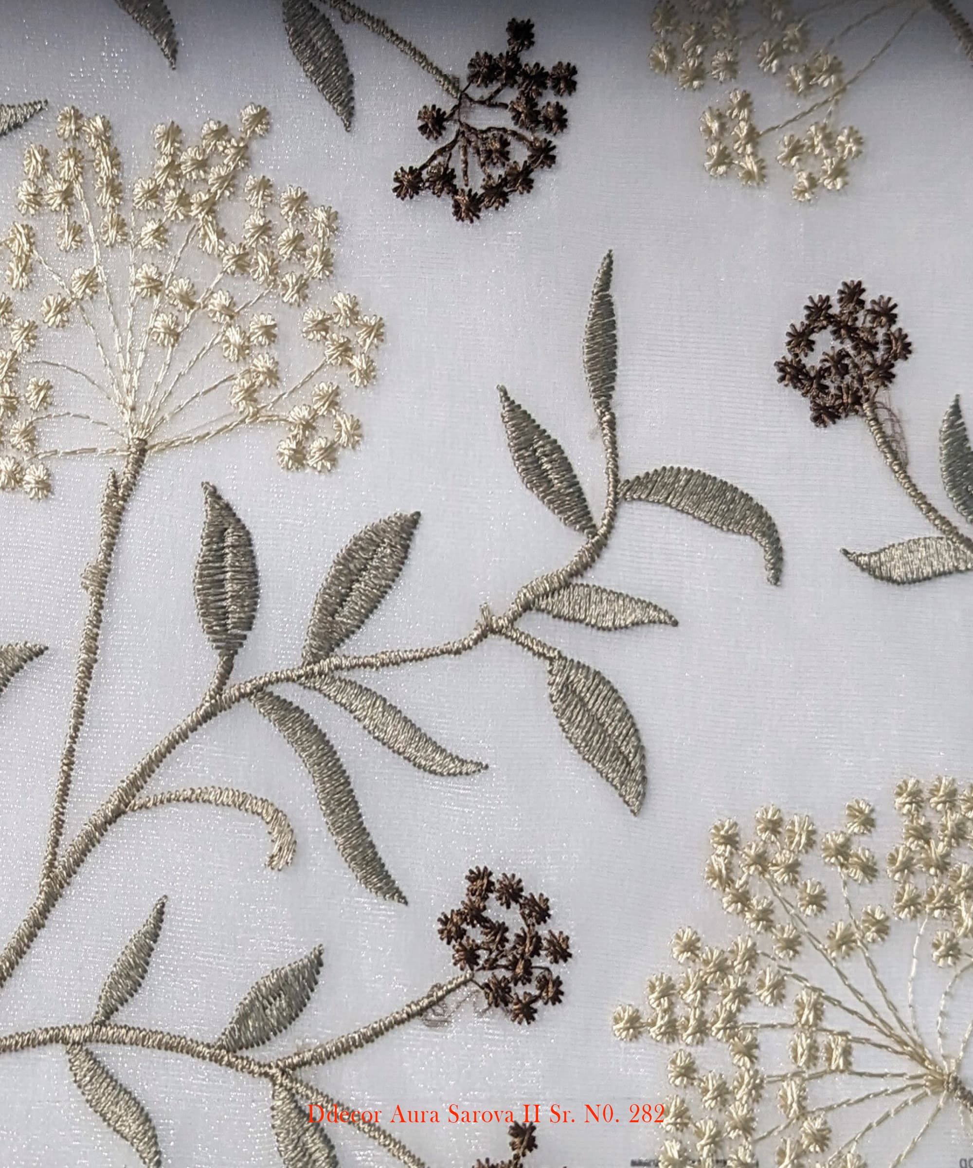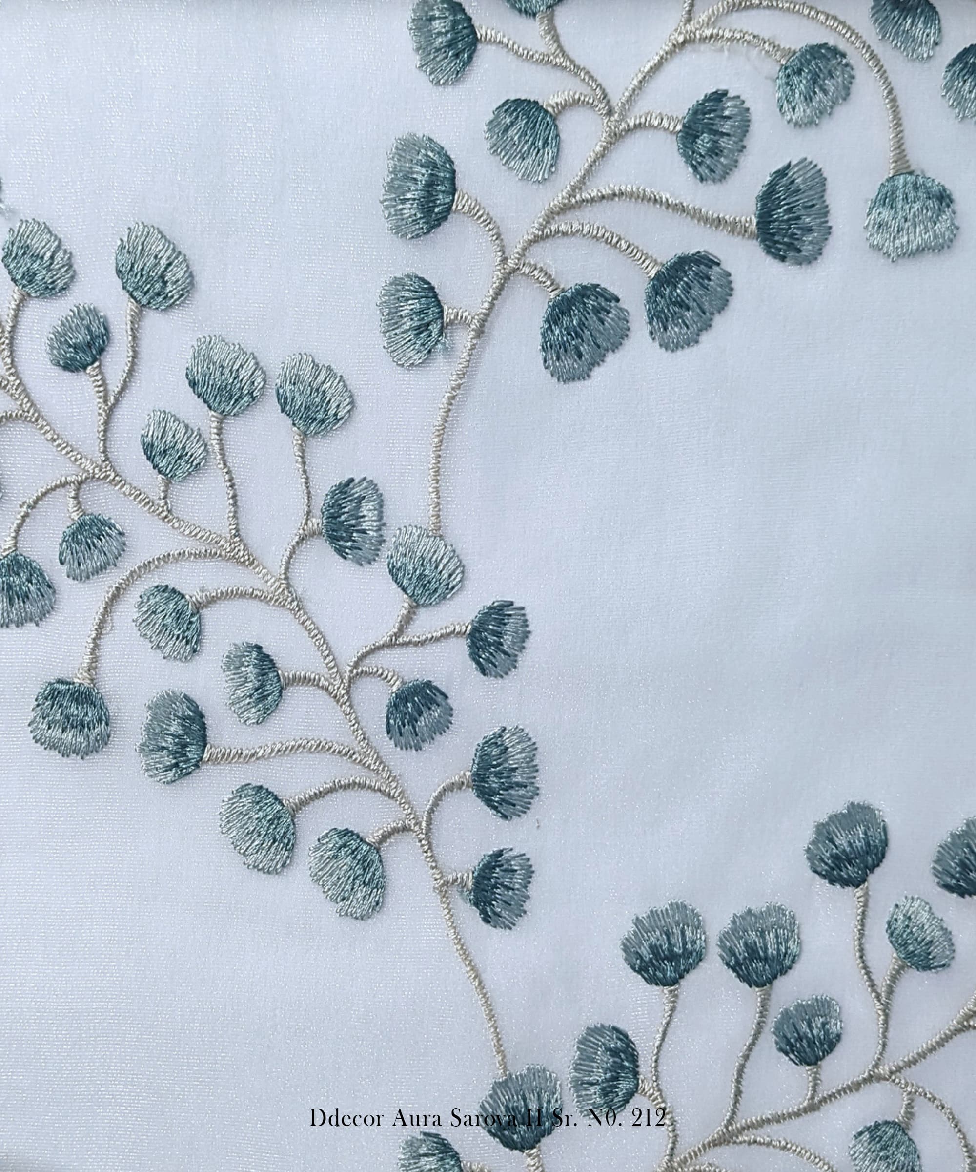 Buy D’Decor’s botanical embroidered sheer fabric for curtains and cushions. Elegant design in 5 colors.