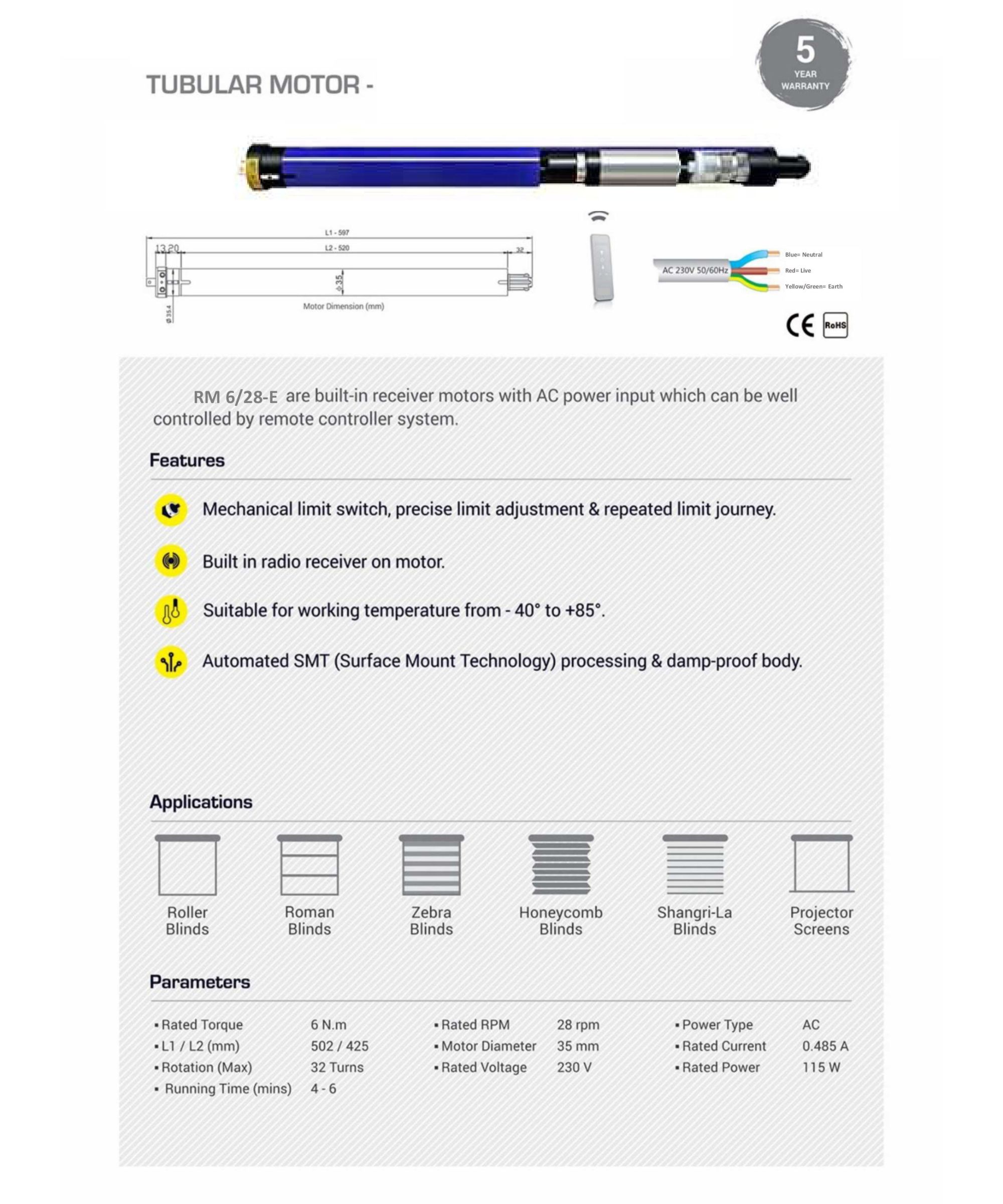 Get RM 6/28 Tubular Motor for blinds and roller setups. Supports up/down control via switch.
