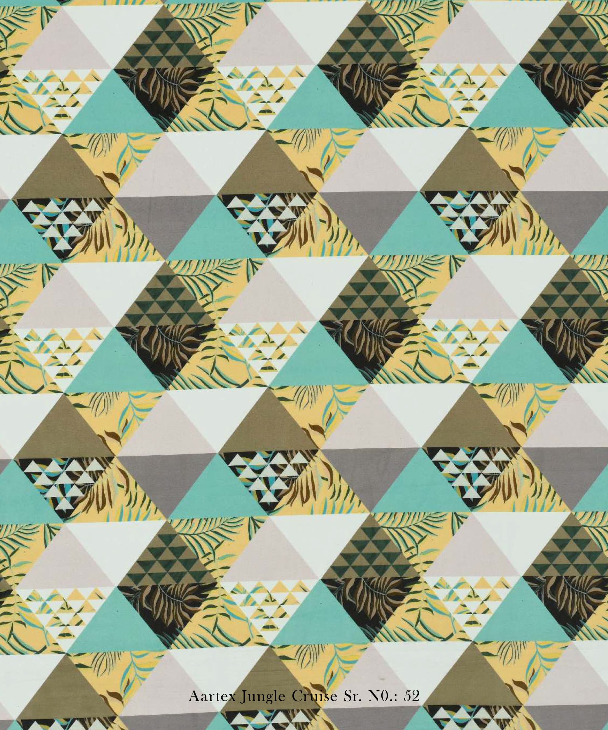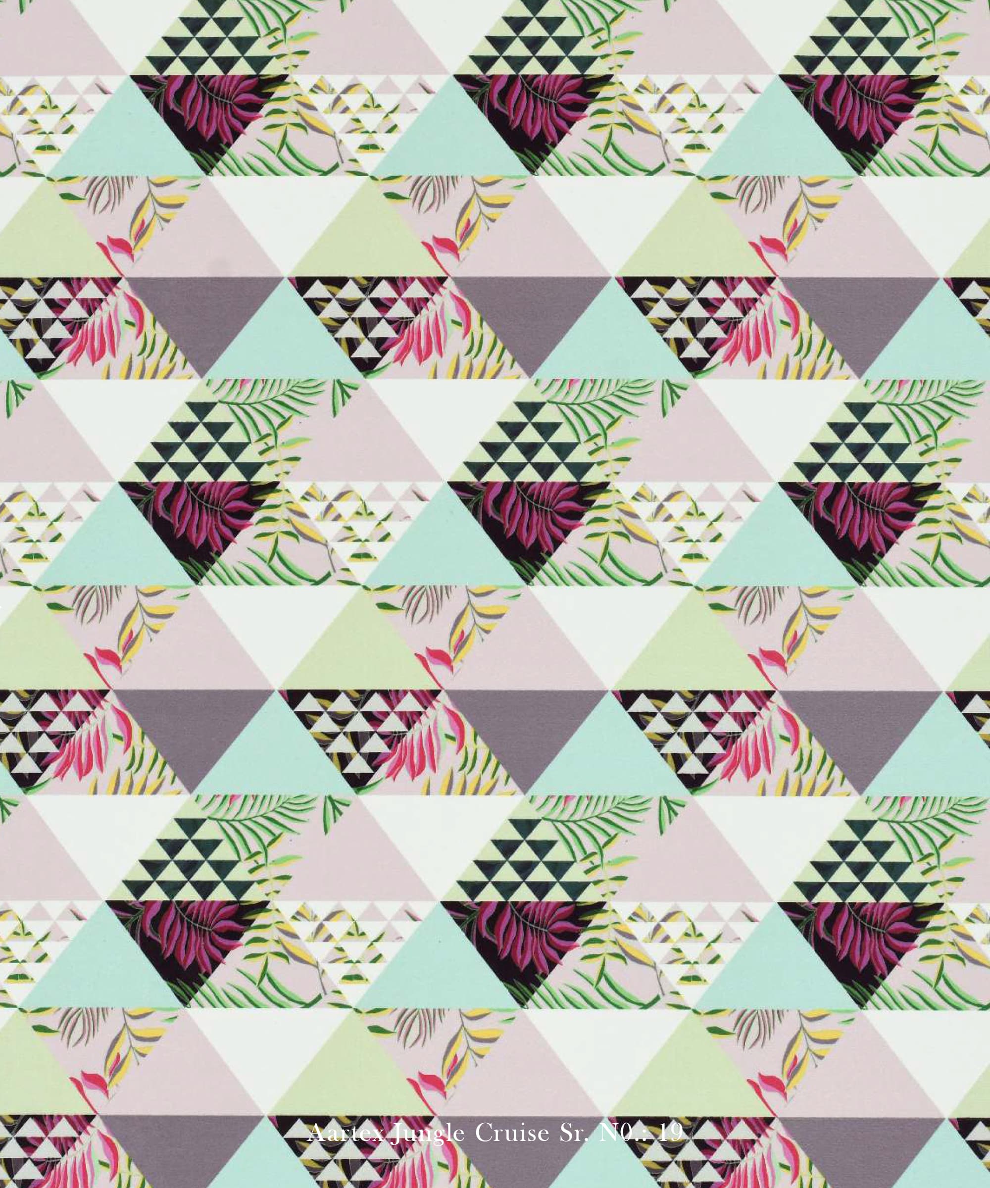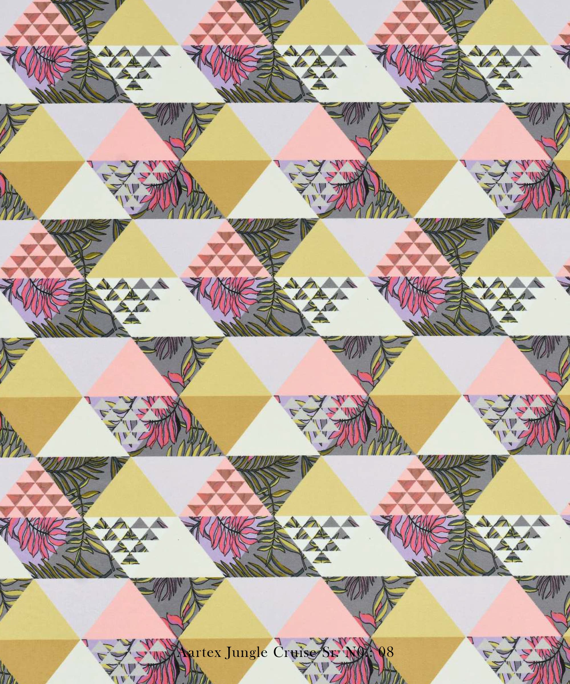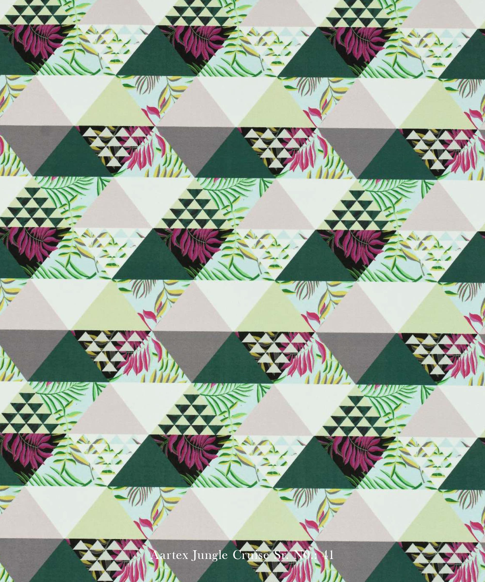 The Trump design from the Aartex Jungle Cruise Collection blends modern geometric patterns with subtle botanical accents, making it a striking choice for contemporary interiors. This fabric features an eye-catching triangle pattern in pastel tones, enhanced with delicate floral details.