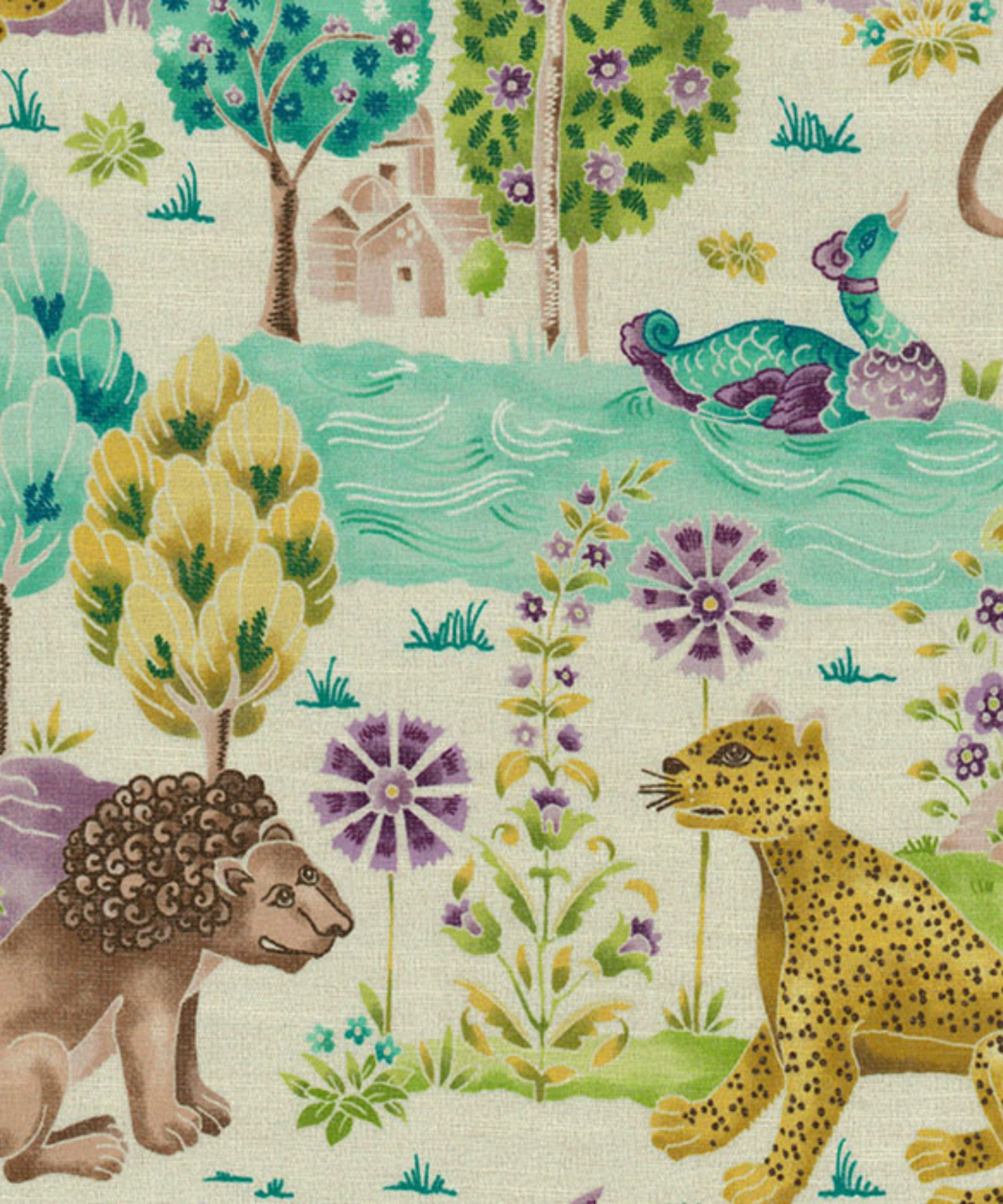 Bring the thrill of the wilderness indoors with these captivating Jungle Print Curtains. Adorned with stylized lions, leopards, birds, and whimsical forest scenes, this fabric creates a rich storybook atmosphere perfect for sparking young imaginations. The artistic mix of greenery, water, and wildlife makes this design an instant hit for children’s spaces.